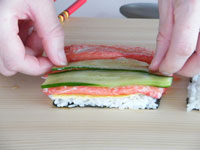 1.このときは「2」で作ったご飯をサランラップに海苔を上にして置きます。海苔の上に具を並べ、これを芯にして巻き込みます。
