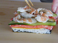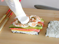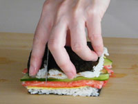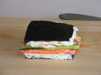 4.ここからが、一番楽しいところ!まな板に海苔が下になるよう置きます。お好みの具をのせましょう。そして一番上に今度は海苔が上になるよう重ねます。よく切れる庖丁の刃を水で濡らし刃を長く使い上手にカットしましょう。切り口から具が見えていいー感じ!!パーティーやお子様のお誕生日にもバッチリのサンドイッチの出来上がり。くれぐれもよく切れる庖丁をお使いください。切れない庖丁で無理やり押し切りはダメですよ!