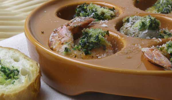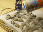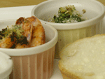 アツアツのプレートごと食卓へ運び、冷めないうちにお召し上がりください。またバケットをいっしょに添えて召し上がると良いと思います。今回は海老、カキでしたがこれ以外にも、白身のさかな、アサリ、オイル漬けのオイスター、イカのゲソ、コロコロのタコ、しいたけとマッシュルームなどバジル風味のソースととてもよく合います。このバジル風味のソースは薄くスライスしたフランスパンに塗り、トースターで焼いていただくだけでちょっとしたおつまみにもなります。