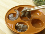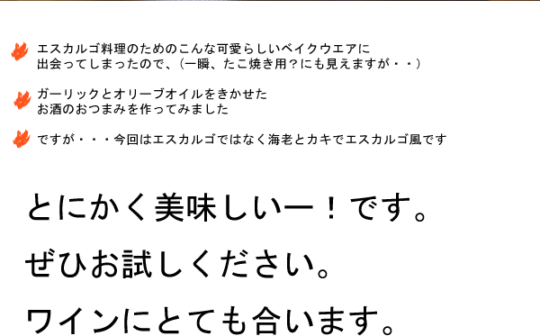 ●エスカルゴと聞くとフランス料理のコースに出てくる一品を思い出しますね。今では冷凍食材として大手のスーパーなどには、くるくる渦巻きのエスカルゴが出回っているようです。エスカルゴ料理のためのこんな可愛らしいベイクウエア(一瞬、たこ焼き用?にも見えますが・・・) に出会ってしまったので、ガーリックとオリーブオイルをきかせたお酒のおつまみを作ってみました。ですが・・・今回はエスカルゴではなく海老とカキでエスカルゴ風です。とにかく美味しいー!です。ぜひお試しください。ワインにとても合います。