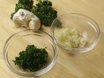 2.次にバジル風味のソースを作っていきます。パセリとバジルはみじん切りにします。(バジルは乾燥のものでもOK)ガーリックはガーリックプレスでつぶします。つぶす方が風味が一段と良いのでお奨めですが、なければみじん切りにします。