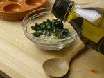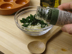 3.「2」のガーリック、パセリ、バジルを小さめの容器で合わせそこへオリーブオイルを少量たらし全体を均一にからめます。