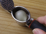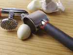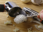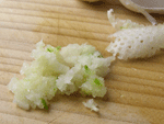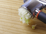 2.次にバジル風味のソースを作ります。(このソースはなかなか万能でフランスパンに塗ってトーストするだけでもとっても美味しいです)ガーリックはガーリックプレスでつぶします。つぶす方が風味が一段と良いのでお奨めですが、なければみじん切りにします。ちょっと余談ですがガーリックのみじん切りは意外とめんどうです!一度ガーリックプレスを使ったらもう離せなくなります。これはホント!!ガーリックを押し出すトゲトゲの出っ張りの面にガーリックの薄皮がペターと張り付き、その皮を楊枝でそっとはがすのが、結構好きです。