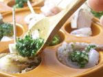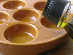 4.カキと海老のときと同様エスカルゴプレートにオリーブオイルをたらーと少量ずつたらします。少なめより多めで良いかも。具材はそのままでも良いですし、楊枝に刺してからプレートの丸い部分に置いても良いですね。(楊枝に刺しておくと食べやすいです)