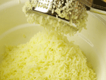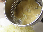 1.皮がついたままのジャガイモをラップにくるみレンジでチン!ジャガイモが熱いうちにポテトライサーでマッシュします。ジャガイモは半分にして切り口を下にしてセットします。あとは蓋をかぶせ、ボウルの中でギューとハンドルを握りポテトを押し出します。残った皮を取り出し同じことを繰り返します。あっという間にボウルの中には、ふわふわのマッシュポテトが出来上がります。
