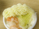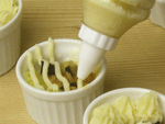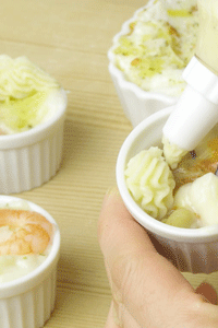 4.グラタンとラザニアの用意が出来ましたらお好みの口金で楽しく搾り出していきます。180度のオーブンで冷凍食品のパッケージに書かれている加熱時間のとおり焼き上げます。