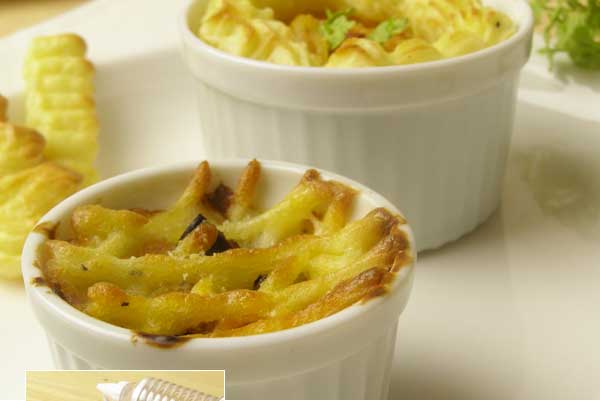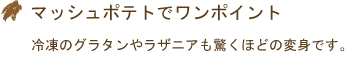 ●とろーりグラタンの日はグラタン皿の周囲に搾り出し、オーブンでこんがりきつね色のマッシュポテトに焼き上げてください。 いつものグラタンも何だかおいしそー!ポテト好きの方いろんなところに搾り出して焼くも良し!あらかじめ焼き上げたマッシュポテトをおつまみにするも良し!ぜひお試しください。