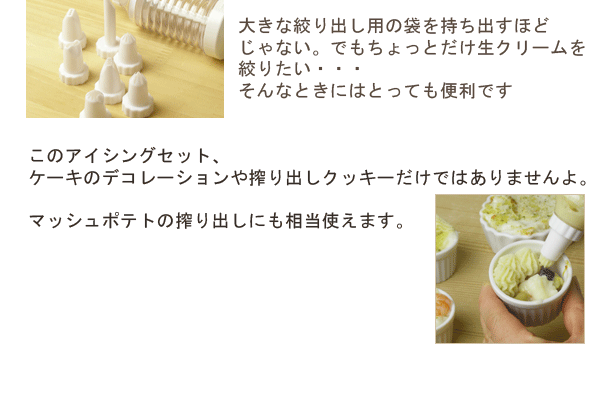 このときの搾り出しにはかなり使えるアイシング用のとっておきのアイテムを使います。このアイシングセット、ケーキのデコレーションや搾り出し クッキーだけではありませんよ。マッシュポテトの搾り出しにも相当使えます