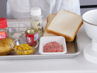 材料(まん丸カレーパン3個分) 6枚切りの食パン 3枚 豚ひき肉 90グラム コーン 20グラム ジャガイモ 小2分の1個 カレー粉 小4分の3 塩 小2分の1 薄力粉 小2