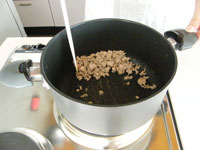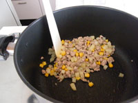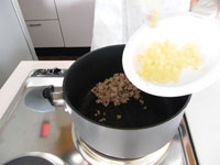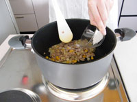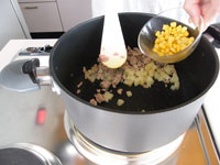 2.ひき肉カレーから作っていきましょう。今回使用したお鍋は【フジマル君】両手鍋 22センチです。フライパンではありませんが炒めもできちゃう優れもの!まず【フジマル君】両手鍋を中火にかけ、そこへ豚ひき肉を入れて炒めます。火が通ったらジャガイモとコーンを加えさらに軽く炒めます。