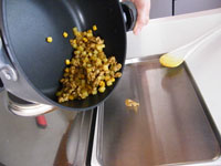 3.全体が馴染んだら味付けをしましょう。塩、カレー粉、薄力粉を加えさらに馴染ませます。全体が均一な状態になったらOKです。これで中にいれる具の完成です。【フジマル君】両手鍋 22センチでの炒め作業が終わったら、キッチンペーパーで内側を拭いておきます。最後の揚げにまた使います。