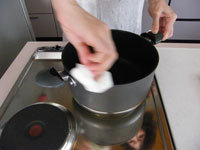 2.【フジマル君】両手鍋 22センチを中火にかけ、パンの耳を熱します。スパチュラで絶えずかき混ぜながら、食パンの水分を飛ばしましょう。表面が乾燥して、ほんの少し焦げ目が付くくらいが良いです。