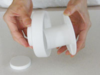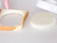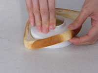 4.いよいよ楽しいパンのカットです。今回使用したのは、何と「ハンバーガープレス」です。この「ハンバーガープレス」で6枚切りの食パンを一枚ずつカットしていきましょう。「ハンバーガープレス」の丸は意外と大きく食パンの耳ぎりぎりですが、できれば耳を避けるように上からギューと押し付けます。そして周囲の余っているパンを上に持ち上げて確実にカットしましょう。慣れるととても簡単!!