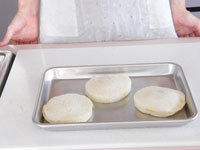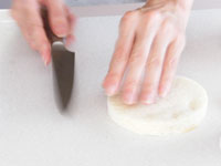 一番難しいのは、まん丸パンの横っちょに庖丁で切り込みを入れるところです。ガマグチのように入り口を小さめに、そして中はたっぷり具が入るよう、縁ぎりぎりまで庖丁を入れます。