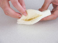 1.あまった食パンの耳をカットしてひとくちサイズにします。