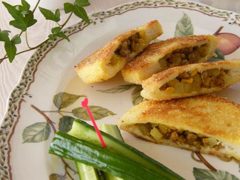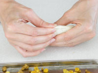 6.開けた部分から準備したひき肉カレーをたっぷり詰めましょう。そして口部分を指でピチっとしっかり押さえます。