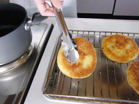 8.【フジマル君】両手鍋 22センチに揚げ油を注ぎます。たっぷりではなく多めの炒めものくらいでOKです。油が熱くなったら1個ずつ入れて両面きれいに揚げ色を付けていきます。キツネ色がポイント!網に取り出し熱いうちにいただきましょう。
