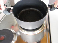 3.そこへ砂糖を加えます。しばらくは砂糖がさらさらした状態が続きます。やがて砂糖の温度が上がり液状になります。そしたら全体に絡むよう、いそいでかき混ぜます。最後にプラリネをふりいれ全体に絡ませます。これで完成!!熱いうちにオーブンシートに取り出し、一個ずつ離しておきましょう。