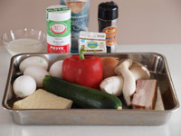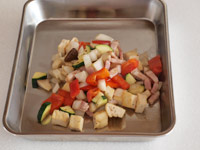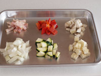 1.玉ねぎ、エリンギ、ズッキーニ、パプリカ、油揚げ、は1.5センチ角にカットします。ベーコンは1センチ幅にカットします。