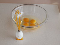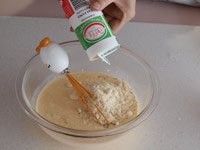 3.次に「卵液」を準備します。ボウルに卵(Lサイズ4個)を溶きほぐします。そこへ生クリーム、牛乳、粉チーズ、塩、コショウを加え全体をよく合わせます。塩は溶けにくいのでしっかりと合わせましょう。