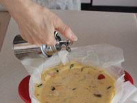 5.「ガラスレンジ浅型鍋」のスノコは置いたままで良いです。クックパー(クッキングペーパーのこと)をスノコの上に敷きます。クックパーに張りがありますので、上手に敷きこんでください)この上に「4」を流し入れます。