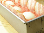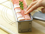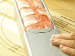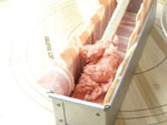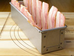 3.「ミニだけどロング缶」にショートニングを塗ります。この型の準備はパンの場合と同じです。本体と蓋の内側にショートニングを塗っておきます。ベーコンを端から重ならないように敷き詰めていきます。