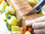 6.200度に余熱したオーブンに入れ約35分焼きます。焼き上がりのチェックは肉の状態を見て確認します。蓋をずらしてケーキテスターや竹串をさしてみましょう。透き通った肉汁が出たら中まで火が通ったことになります。