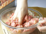 ◇お肉の脂分の割合によってお肉の縮み具合が微妙に違うようです。あまり赤身ばかりでもちょっと物足りないですし、かと言って脂身が多すぎてもしつこくなりすぎますので、そのあたりはそれぞれのご家庭のお好みの部位でお試しください。ちなみに私は赤身の合挽き6割に対してやや脂身が見える程度の豚挽きを4割のバランスが好きです。