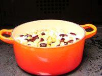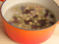 白米と玄米はといで、1時間ほど水につけておきます。お鍋に分量のお水と水気を切った白米・玄米・お豆を入れて、ふたをしてオーブンへ。
