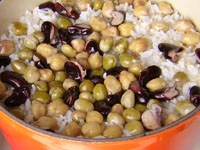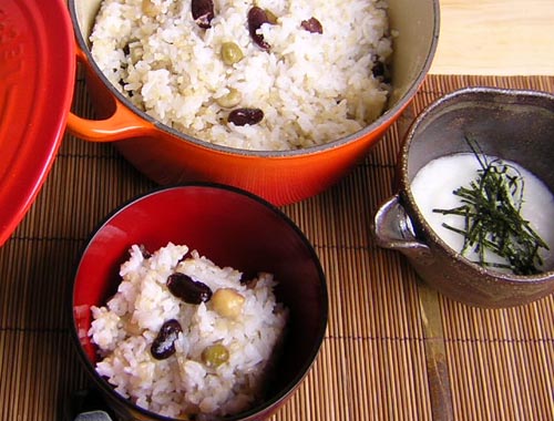 さあ、お豆いっぱいのご飯をおしゃもじで、ほっこり粘らないように、お豆と玄米が均一になるように、混ぜてください。ここは、重要ポイント。