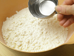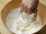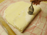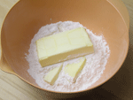 ●冷やしたバターを切り込んで小麦粉に馴染ませる簡単折り込み式のパイ生地です。初めから生地にたたみ込む本格的なパイ生地に比べ、気軽に作れますからここは頑張ってサクサクのパイ生地に仕上るよう頑張りましょう!