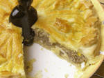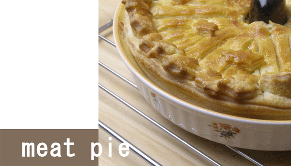 ジューシーミートパイ ●寒い冬にはあったかジューシーミートパイ。たっぷりお肉にマッシュルームとゆで卵を加えコショウをしっかり効かせて焼き上げます。熱いうちにフーフー言いながら召し上がってください。肉と野菜の余分な水分はパイバードが適度に蒸発させてくれます。パイの真ん中に宿ったパイの守り神、そんなパイバードのおかげで今日のパイはとびっきり美味しく出来ました。貴女は粒マスタード派?それともケチャップ派?でもまずは何も付けずに召し上がってみてください。