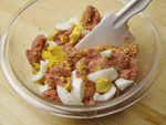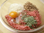 1.具の用意をいたします。マッシュルームはざく切り、ゆで卵は殻をむいて厚めの輪切りにします。 2.ボウルにゆで卵以外の材料を全て入れます。豚ひき肉・牛ひき肉・マッシュルーム・パン粉・具のつなぎ用としての卵1個・塩・コショウ・ナツメッグ・バジル、これらをハンバーグを作る要領で粘りが出るまでよく捏ねます。だいぶ粘りが出たところで厚めの輪切りにしたゆで卵を加え、軽く全体に混ぜ込みます。これで具の準備は出来ました。使うまで冷蔵庫で待機させておきます。 |