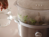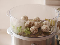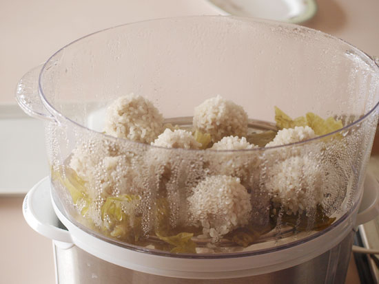 4.ステンレスのスノコにレタスを敷き、蒸気が上がったら「餅米肉団子」を並べ25分蒸し上げます。途中で水量が減ってきたらサイドの注ぎ口から水を足してください。