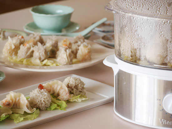 ●ビタントニオのスチーマーで楽しくわいわい「飲茶パーティー」開催しましょ!食卓にスチーマーを置き、熱々ジューシーな飲茶をいただきます。野菜たっぷりの飲茶は市販のシュウマイと餃子の皮に具を包んで仕上げました。湯気までご馳走の飲茶パーティー!実際の作業にはボッシュのスタンドミキサーにマルチブレンダーをセットして一気にダダーッとチョップしたので、野菜を刻む手間も省け快適に仕上がりました。今年一番のお勧めの飲茶パーティーです。