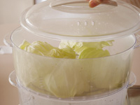 4.「ビタントニオ・スチーマー」の準備をします。ステンレスのスノコにレタスを敷き、蒸気が上がったら具を包んだ餃子を並べます。蓋をして10分蒸し上げます。これで出来上がり