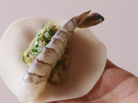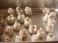 2.皮に具をのせひだを寄せて包みます。「海老蒸し餃子」は具を置いた上に海老をのせひだを寄せて包みます。
