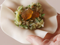 3.「にらまんじゅう」は餃子の皮を麺棒でひとまわり大きく伸ばします。濃いめの鶏スープをゼラチンで固めたゼリーを入れるとより美味しくなります。
