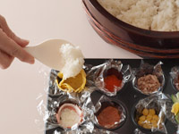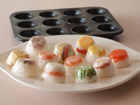 MEMO お友達にお家に持って行くなら、ラップをしたままが良いですね。ひとくちサイズが可愛いお上品な手まり寿司です。ミニマフィン型で焼くケーキもいいけれど、こんな使いも「あり!」ですよ。