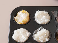 1.「12個取りのミニマフィン型」にラップを敷きます。具とご飯を詰めたあと、キュッとラップで閉じますので、ラップは少し大きめにカットしてください。