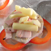1.里芋の皮をむいたら水にさらし、2〜3回水を代えながらアクを抜きます。赤いパプリカは輪切り、ベーコンは2ミリにカット。