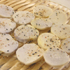 3.少し冷めるまでそのまま置いておきます。里芋が冷めたら5ミリほどの厚さにカットし広げ、クレイジーペッパーとクレイジーレモンペッパーをふって味をなじせます。 |