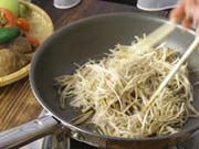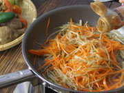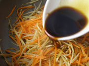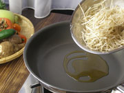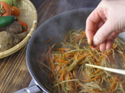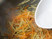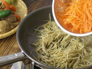 3.フライパンを火にかけ熱くなったら弱火。サラダオイルを回し入れ、続けてゴマ油も入れ中火でゴボウを炒めます。全体にやや透明になったら人参も入れ炒めます。油が足りないようでしたら少しサラダオイルを加えます。
