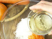 4.大根とにんじんの水気をしっかりと絞ります。塩気を流水で洗い流し最後に固く絞ります。 5.ボウルに固く絞った大根とにんじんを入れ、合わせ酢を注いよく合わせます。