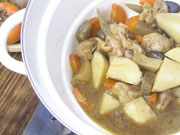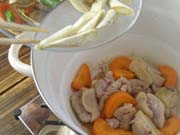 2.富士ホーローのお鍋を中弱火にかけ、少し温まったところでサラダオイルを回し入れます。最初に鶏肉を入れて炒めます。次にゴボウ→人参→と材料をいれるごとに、よく炒めながら最後にこんにゃくとシイタケを加え全体にオイルを絡めます。