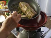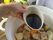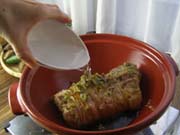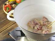 4.全体に焼き色が付いたら、「ココット・タイ」に移し替えここからは弱火で煮込んでいきます。20分ほどでひっくり返します。そのままさらに30分煮込みます。蓋と本体のところがシュルシュルし過ぎていたら火をさらに弱めます。蓋に空気穴が開いていないお鍋ですので、水分が抜けにくく、また適度な圧力もかかり、とても上手に煮上げてくれる、ありがたーい「ココット・タイ」ですね。
