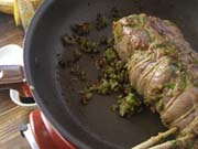 3.フライパンを火にかけ熱くなったらサラダオイルを回し入れ、みじん切りの長ネギと生姜を炒めて香りを出します。そこへ、タコ紐で縛った豚の肩ロースを入れ表面に焼き色をつけていきます。
