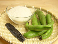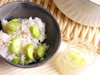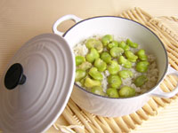 そら豆はさやから出し、皮をむいておきます。ご飯の炊き上がる5分前にココットロンドに入れます