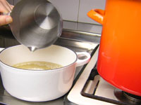 ざるにあげてある白米を、ココットロンドに入れて、スープを注ぎます