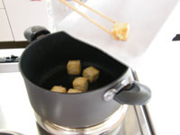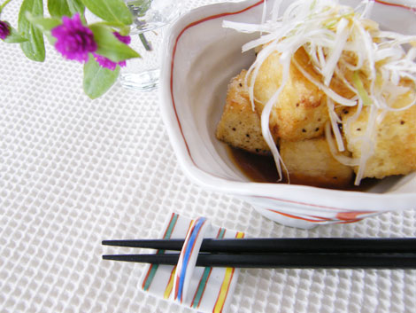●大豆食品の代表選手!お豆腐を美味しくいただきましょ!木綿豆腐の水気をきって片栗粉を薄っすらつけてカリッと揚げましょう。少なめの油でも大丈夫!菜ばしとフライ返しを上手に使って、ひっくり返しながらカリっと仕上げましょう。